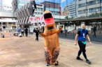 サウルスの着ぐるみと一緒に走るという形を考えました。我々が交替でティラノになり、